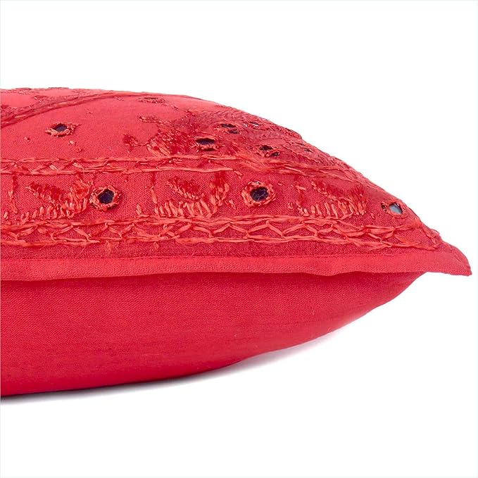 Eyes of India Embroidered Decorative Boho Throw Pillow Cover with Mirrors, Handmade Bohemian Accent Cushion Case for Sofa Couch Bedroom Living Room (Red, 24" x 24")