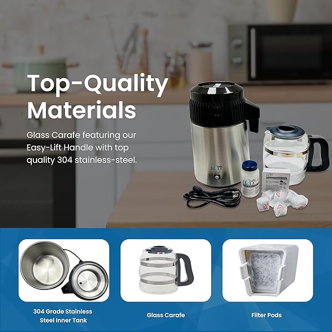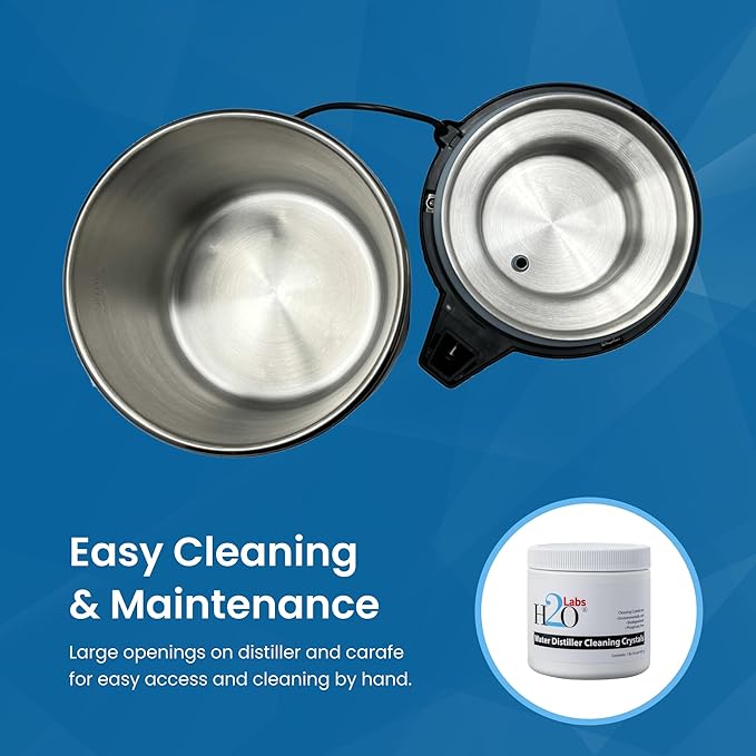 - Everything You Need: Along with your water distiller and glass carafe, you'll receive a 6-pack of exclusive H2o Labs carbon pods, a large jar of cleaning crystals for hard water scale, and an informative, easy-to-understand instruction manual.