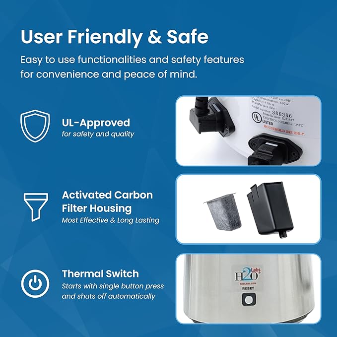 - H2o Labs Best-in-Class Models: Our most popular countertop Model 300SS water distiller for home & office has a stainless-steel exterior, evaporator & condensing coil, and it has a top-quality 1 gallon glass carafe with ergonomic “Easy Grip” handle.