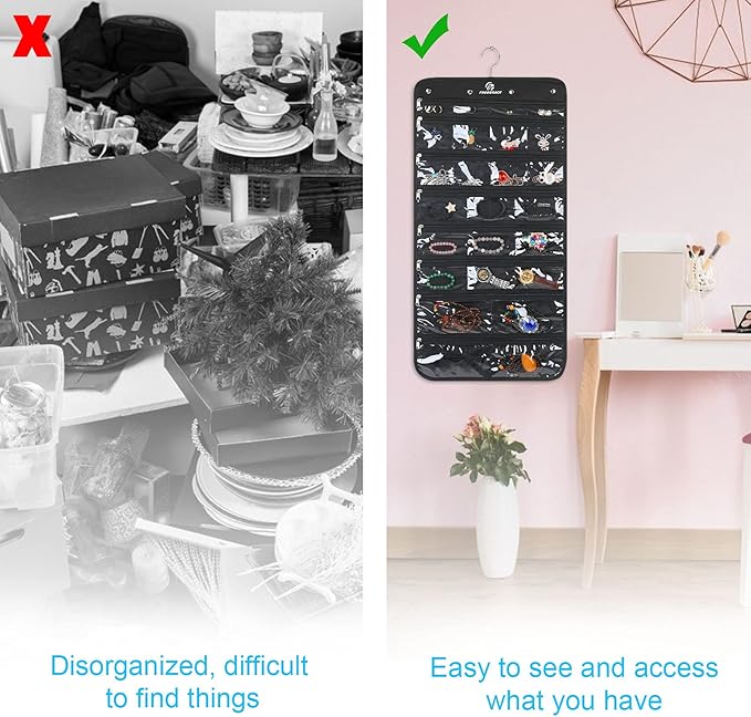 - 2 VERSIONS TO CHOOSE FROM: In addition to the 50 pockets version, we offer an alternative hanging jewelry organizer with 25 transparent pockets and 23 Hooks! Choose whichever fits you and put all your rings, earrings, lockets, necklaces, watches, brooches, pins and other jewelry in order!