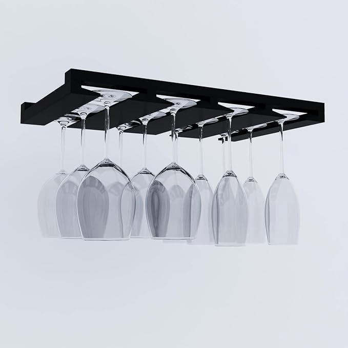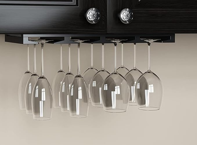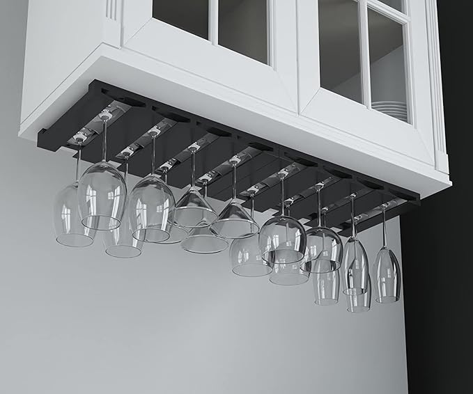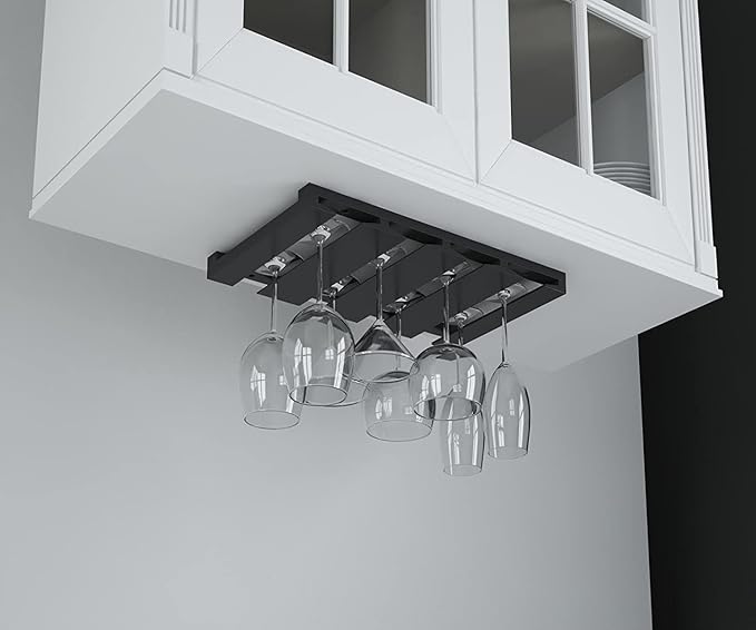 - EASY TO INSTALL - Get your glasses off the counter in less than 5 minutes. Easy to mount under cabinet with the screws provided. Fits 6 to 12 glasses (depends on the diameter of the glass base)