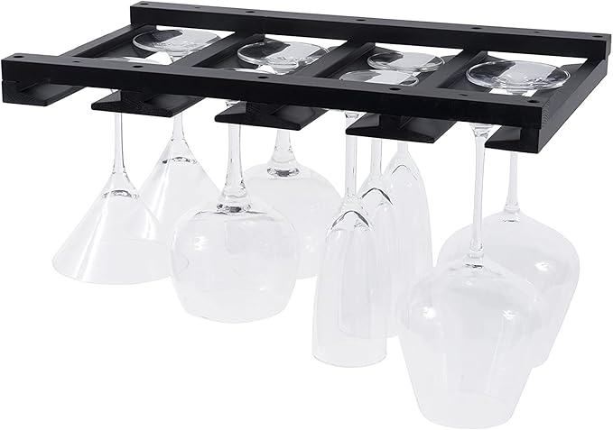Rustic State Eze 4 Sectional Wood Under Cabinet Wine Glass Holder Wine Glass Rack Hanging Shelf Stemware Bar Organizer - 12 Wine Glass Storage - 10 Inch Deep - Black
