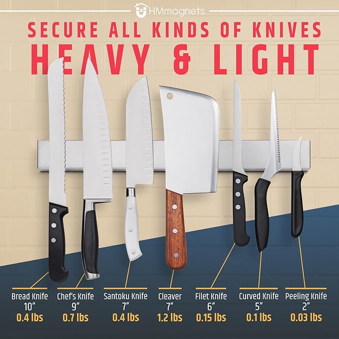 - FIT ANY KNIFE: This knife strip can hold any type of knife firmly without slipping or shifting, making it perfect for Chef's knives, Butcher knives, Cleavers, Bread knives, Carving knives, and more.