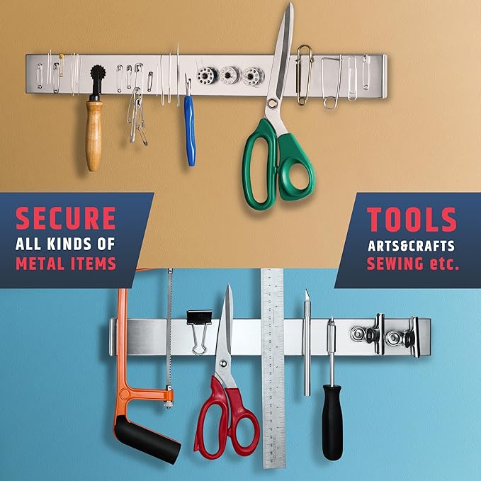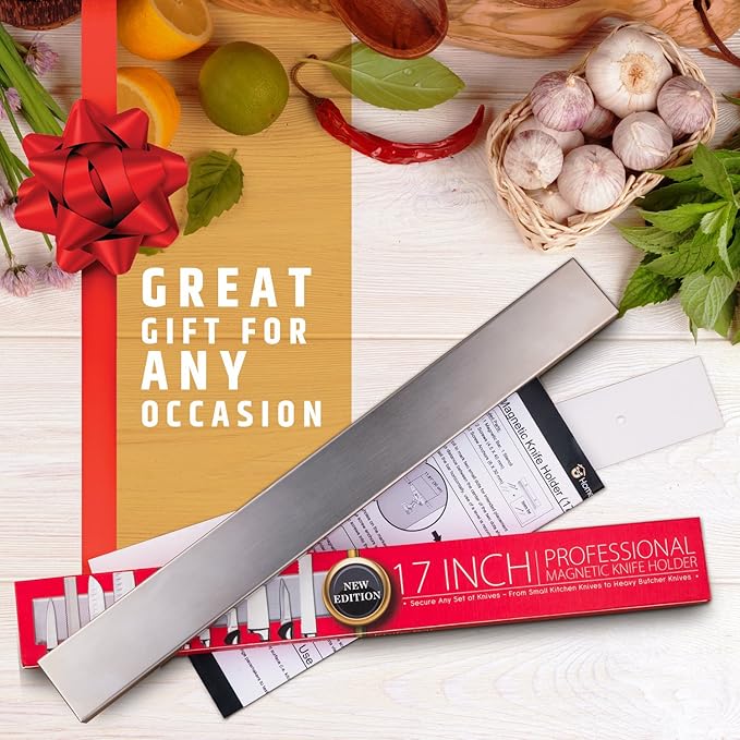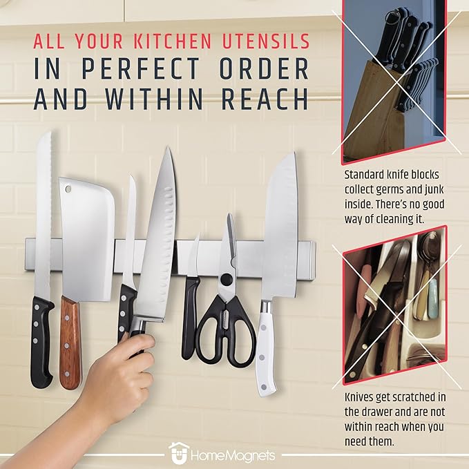 - POWERFUL MAGNETS: Our 17" stainless steel knife holder features heavy-duty magnets that won’t lose strength, holding your knife set securely. The magnets distribute force evenly, allowing full use of the bar length and easy knife release with a gentle tug.
