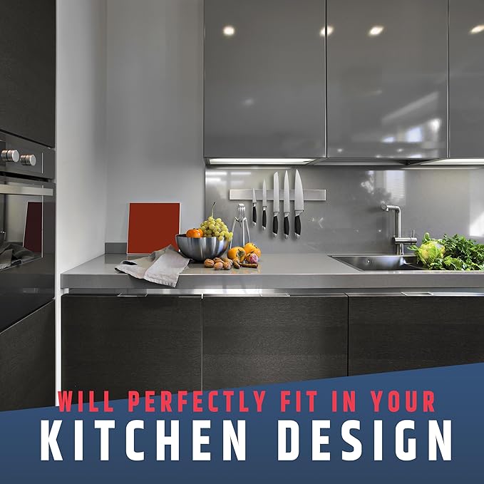 - MODERN DESIGN: Our knife holder boasts a sleek and elegant design made from high-quality stainless steel that fits any kitchen style. The bar is designed to "float" on your wall, hiding the magnets and mounting screws for a clean and simple installation.