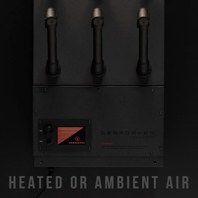 - HEATED OR AMBIENT AIR and CUSTOMIZABLE TIME SETTINGS. GearDryer heats the air temperature approx. 35 degrees above ambient air temperature for gentle drying and warming and allows for timed drying options from 15-minutes to 24-hours
