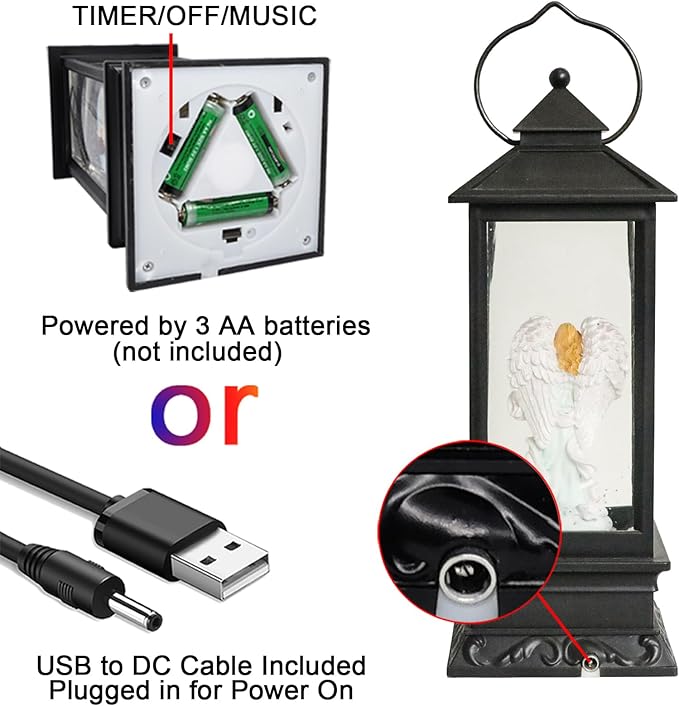 - ★POWER SUPPLY: Included USB to DC cable allows you operate the snow globe lantern without batteries. You can also operate it with 3 AA batteries, so that you can place them any where you want.
