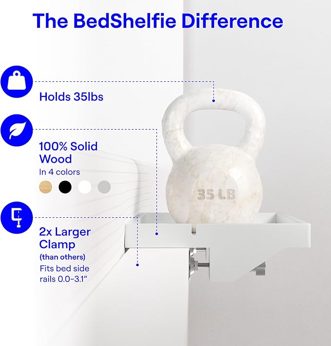 - BUILT TO LAST, BACKED BY UNMATCHED SUPPORT: At BedShelfie, we're committed to crafting high-quality bedside shelves that stand the test of time—backed by lifetime customer support. Each BedShelfie nightstand is available in a range of modern finishes, including natural, black, white, and gray Bamboo, or eco-friendly, recyclable plastic in black and white. Designed for durability and everyday use, it's the perfect addition to any space—whether you're outfitting a cozy dorm, upgrading your loft or bunk bed, or looking for a stylish floating shelf with a built-in cup holder. An essential for dorm living, smart spaces, and clutter-free comfort.