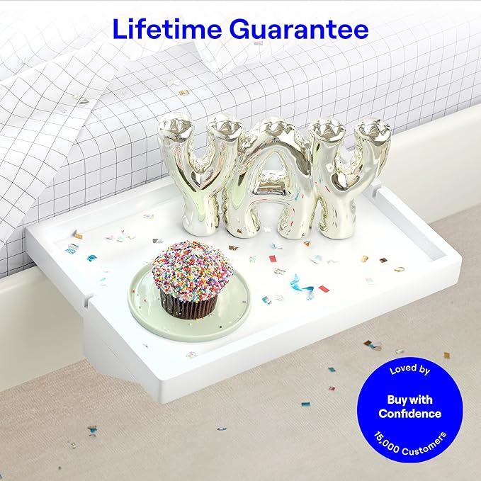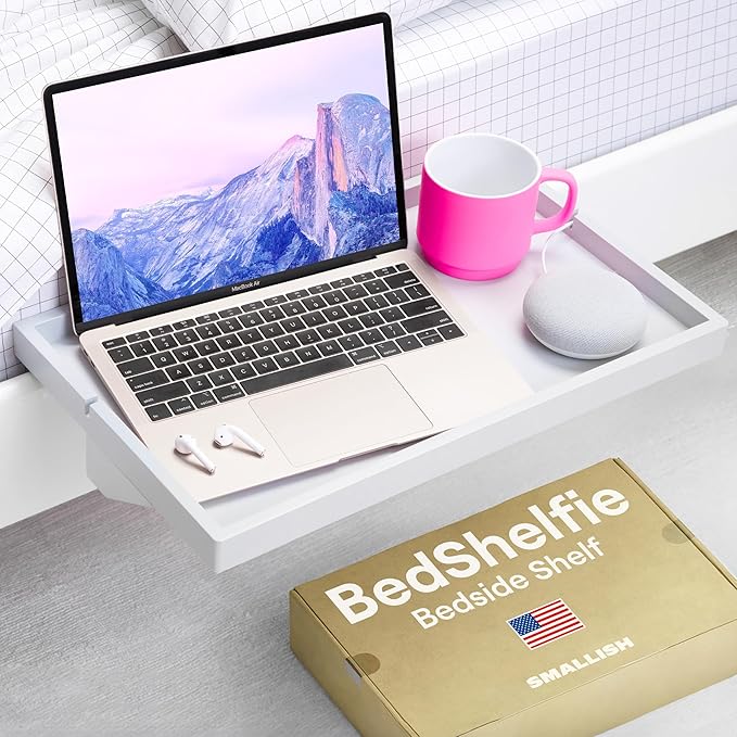 - EFFORTLESS DESIGN, ENDLESS VERSATILITY: The BedShelfie caddy tray is all about simplicity and convenience—no complicated setup required. Whether you're using it as a headboard shelf, sofa tray, changing table, or cord organizer, it adapts to your lifestyle with ease. Loved by city dwellers and students alike, it's a dorm room essential, teen nightstand, or kid-friendly side table. With a sturdy 35lb weight capacity, it securely holds everything from your 13-inch MacBook to your phone and water bottle. Perfect as a floating nightstand or compact shelf for bunk beds, loft beds, and college dorms—complete with a built-in cup holder that slides right into bed life.