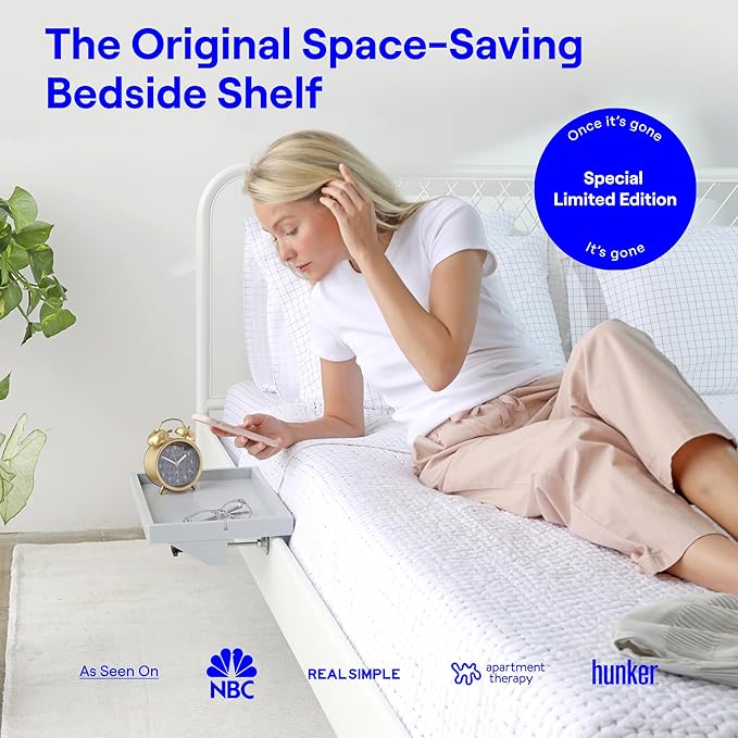 - ORIGINAL, TIME-TESTED DESIGN: Originally launched on Kickstarter and designed in Los Angeles, the BedShelfie bedside shelf has been featured in top publications like Apartment Therapy, BuzzFeed, and Real Simple. This innovative bed shelf organizer is perfect for small space living, whether in tiny bedrooms or dorm rooms with top bunks. The BedShelfie is the go-to choice for bedside organization, offering storage solutions for nightstands, loft beds, and floating shelves. Maximize your space with style and functionality!