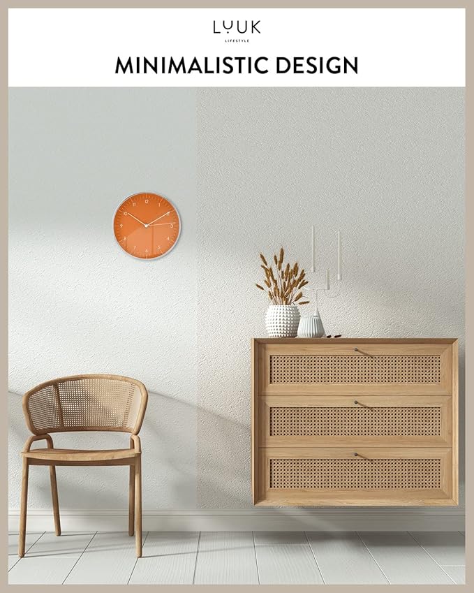 - SILENT MOVEMENT: This non-ticking quartz wall clock, vividly designed in a bright orange color, comes with a second hand and embodies a minimalist, Scandinavian design; The Arabic numerals are readable from a distance
