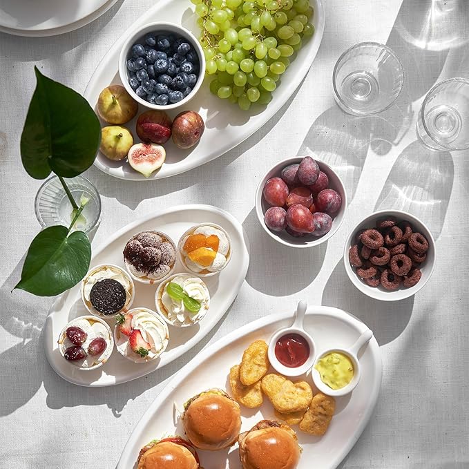 - Microwave, Dishwasher & Oven Safe -- Made of durable porcelain, serving dishes off white are durable and safe for microwave and dishwasher. 100% recyclable and healthy for your daily use. This food platter set is tested for its sturdiness and longevity. It can survive within your family for generations.