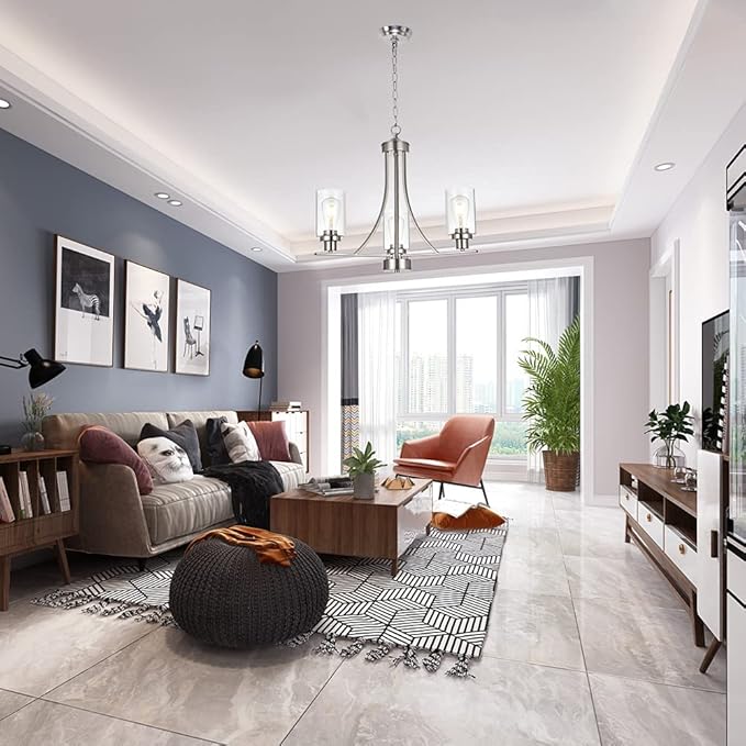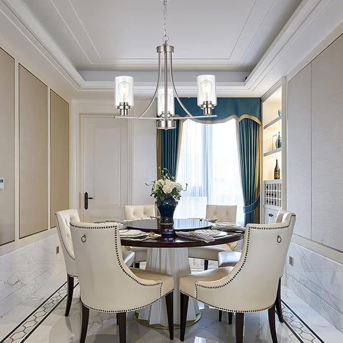 - ๐ 3 Light Modern Glass Chandelier: This rustic kitchen dining room chandelier with high clear glass shades๏ผit is an elegant update for traditional and modern homes alike.It's the perfect light fixture to install in kitchen, island, dining room,living room,foyers ,hallway,bedroom,coffee bar, lobby, restaurant and any space you like.