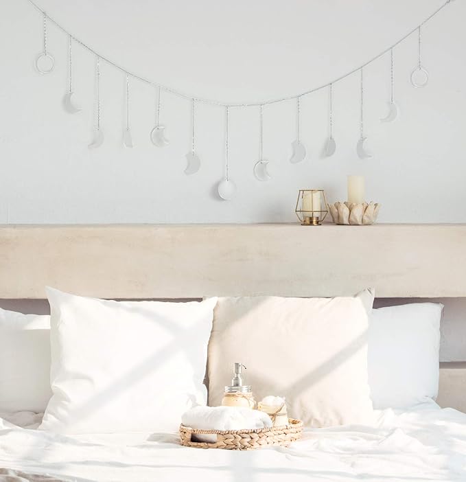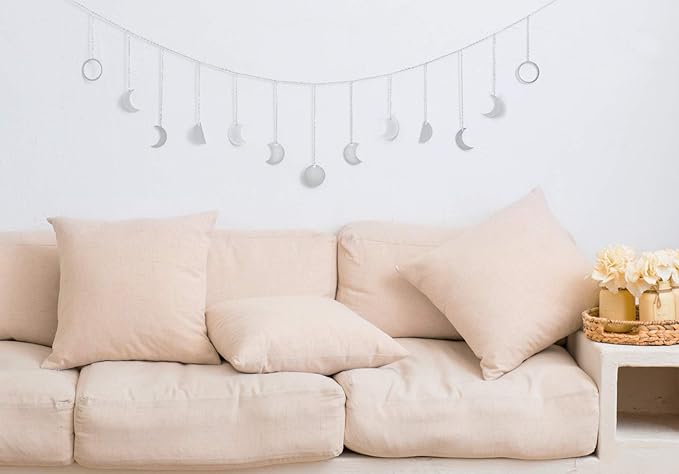 Mkono Moon Phase Wall Hanging Boho Aesthetic Room Decor Metal Moons Garland Hanging Art Bohemian Home Decoration for Girls Room Nursery Bedroom Livingroom Dorm, Ideal, Silver, 55"