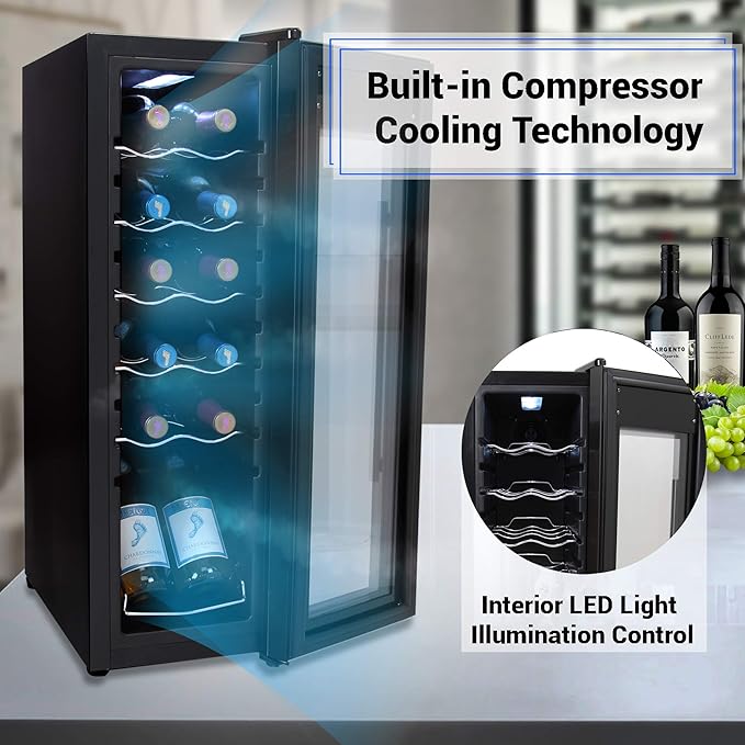 - WINE CHILLING EFFICIENCY: Preserve your wine's flavor and aroma, while keeping them chilled at the desired, adjustable temperature in our small wine fridge. The efficient cooling technology ensures each bottle is perfectly chilled for your enjoyment.