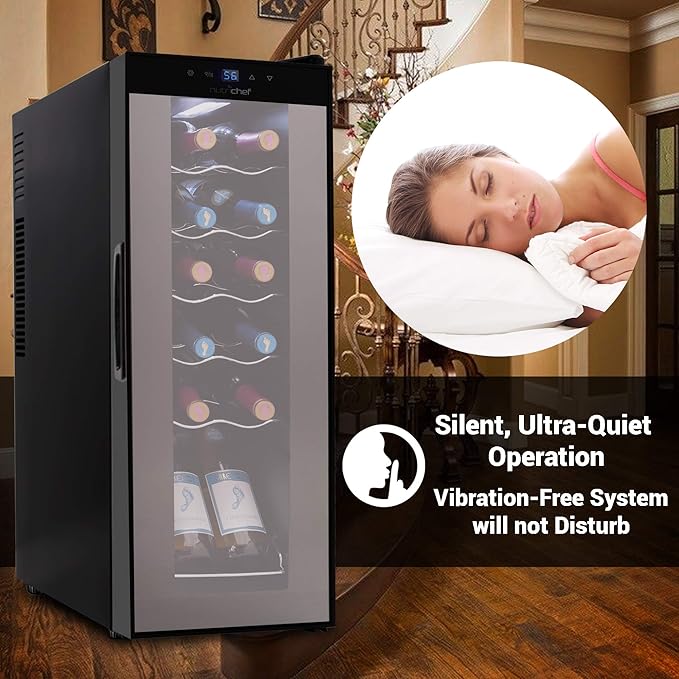 NutriChef PKCWC120 White & Red Cooler-Freestanding Countertop Compact Mini Wine Fridge Chiller Capacity, Digital Control, Glass Door, 12 Bottle-Black