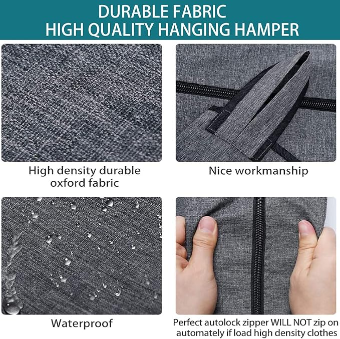- 【DURABLE FABRIC AND MATERIALS】This over the door hamper bag is made of durable 600D tear-resistant oxford fabric,waterproof and machine washable.The reinforced sewing thread for whole laundry bag,plus the double lock stitches on zipper that help extend the service life of this hamper, it can be used even more than 5-8 years.Very good value for money.