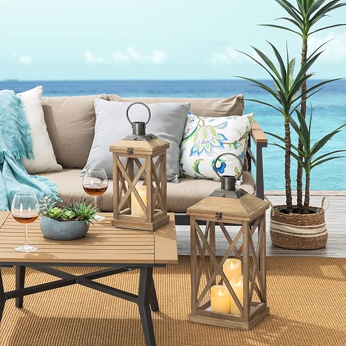 Glitzhome Mondern Farmhouse Wood Metal Lanterns Decorative Hanging Candle Lanterns Set of 2, Natural (No Glass)