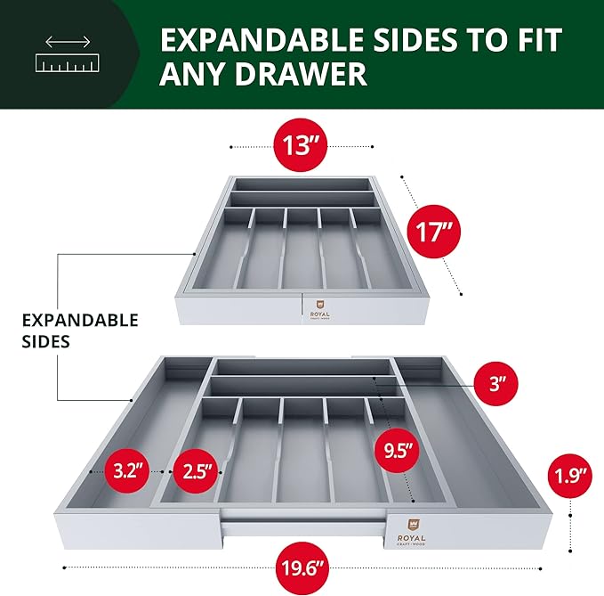 - πΏππππππππππ ππ π ππ ππππ ππππππππ πππππππ πππππππ: Our deep bamboo drawer organizer is ideal for saving kitchen storage space, thanks to its adjustable storage drawers that expand from 17βx13β to 17x19.6β wide with 1.9β deep slots. Easy to use and ideal for helping to maximize kitchen storage space, simply pull apart from the sides for additional storage space and a more secure fit for wider drawers. Different sized compartments allow for standard silverware and large utensil placement