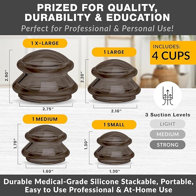 - Your EDGE cupping set includes 4 cups: 1 Extra-large (2.75"), 1 Large (2.10"), 1 Medium (1.60"), and 1 Small (1.30"). This range ensures optimal coverage for all body areas, muscles and joints. Perfect for myofascial release, lymphatic drainage, cellulite massage and muscle recovery.