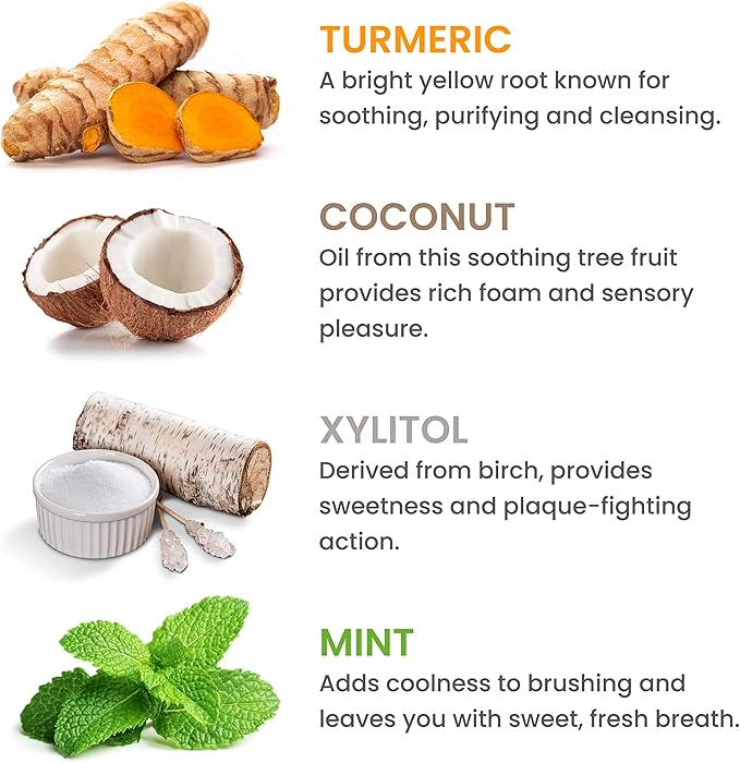 - Herbal teeth whitening toothpaste: Combines a botanical boost from golden Turmeric, celebrated for its cleansing and wellness properties, with soothing Coconut Oil to deliver a sparkling smile