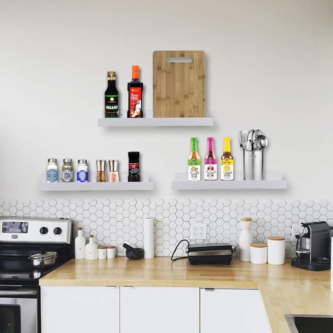 - Versatile and Multi-Scene: AZSKY floating shelves are designed to be functional. Perfect for displaying your photos, artwork, plants, trophies, these wall ledge shelves add life and a personal touch to your interior. Our floating picture shelf is perfect for any interior space, such as your kitchen, living room, bathroom, bedroom or even office.