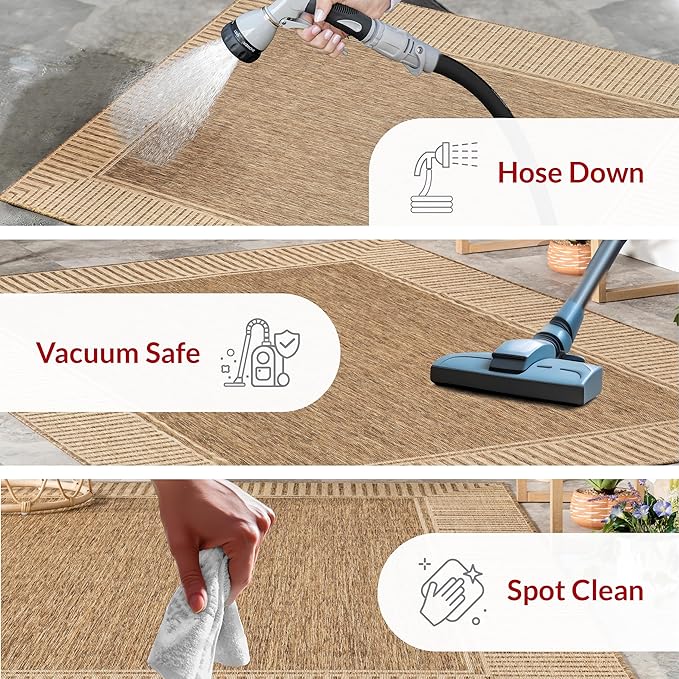 - Weather and Stain-Resistant: Keep your indoor/outdoor rug looking pristine effortlessly. Its stain-resistant properties make cleaning your area rug a breeze, allowing you to maintain its beauty. This area rug is a great choice for outdoor spaces!