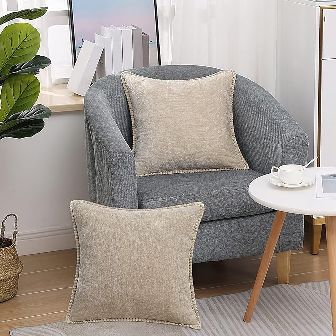 decorUhome Chenille Soft Throw Pillow Covers 20x20 Set of 2, Farmhouse Velvet Neutral Decorative Euro Pillow Covers with Stitched Edge for Couch Sofa Bed Home Decor, Beige