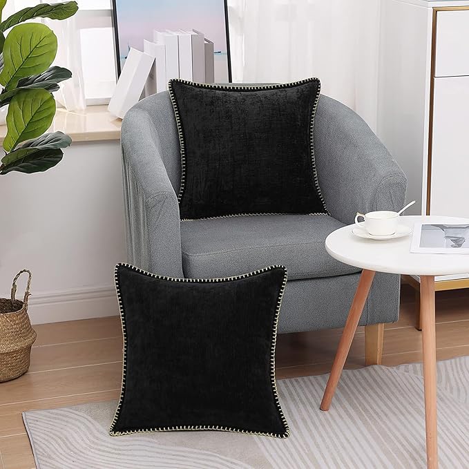 decorUhome Chenille Soft Throw Pillow Covers 24x24 Set of 2, Farmhouse Velvet Neutral Decorative Euro Pillow Covers with Stitched Edge for Couch Sofa Bed Home Decor, Black