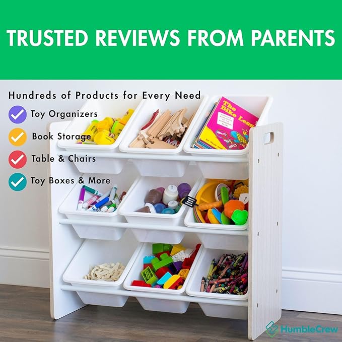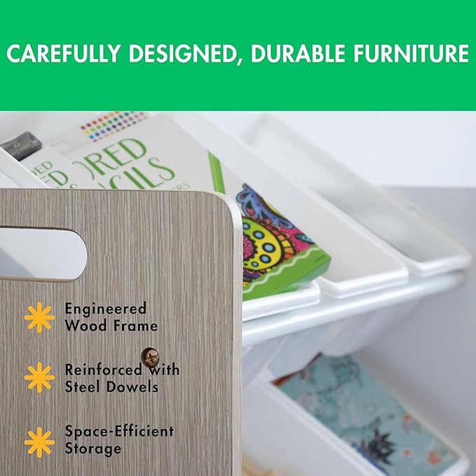 - Removable Bins: Includes 9 BPA and phthalate-free plastic bins (12"L x 9"W x 6"H) that are easy to remove, replace, and reposition for effortless organization.