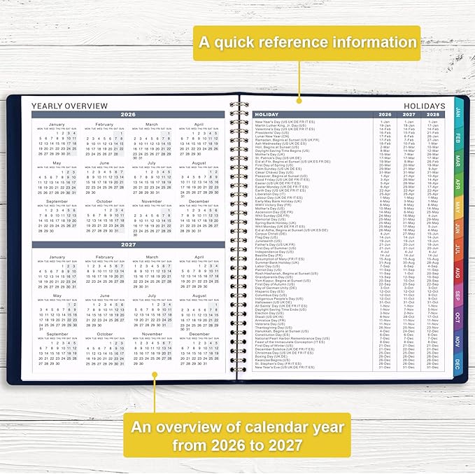 - PERFECT ORGANIZATION: There are 1 page of yearly overview for 2026-2027| 1 page of major holidays of 2026-2028| 1 page for quick reference information. Besides, there are past and future months reference calendar on every weekly page in this weekly appointment planner.