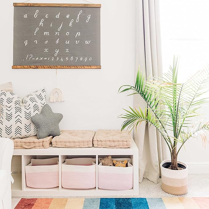 - Discrete, Built-In Carry Handles – These fabric rope baskets for storage also feature slim hand holds built right into the sides of each round basket for a seamless look that’s also functional. Perfect for picking up toys or carrying items around the house.