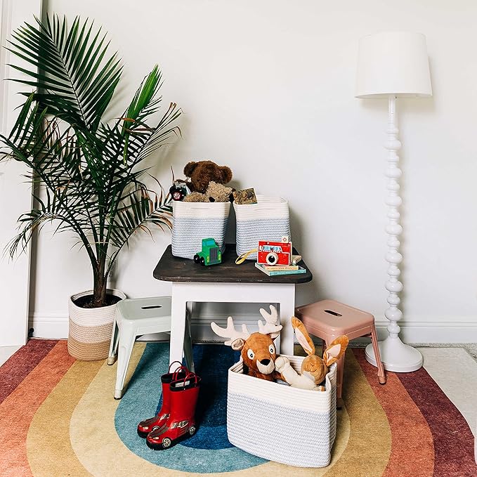 - Discrete, Built-In Carry Handles – These fabric rope baskets for storage also feature slim hand holds built right into the sides of each round basket for a seamless look that’s also functional. Perfect for picking up toys or carrying items around the house.