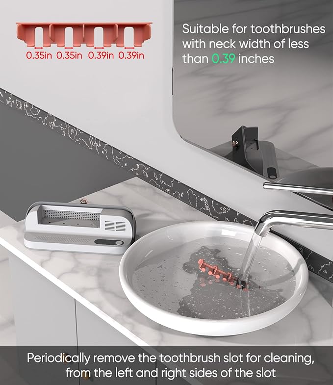 - Elegant Toothbrush Holder - Professional designers are devoted to design every detail, round and smooth corners, and delicate surface craftsmanship. This UV toothbrush dryer not only keeps your countertop tidy, but also a cool stuff in bathroom. The hanging slot makes it compatible with 99% of electric and manual toothbrushes including Oral-B
