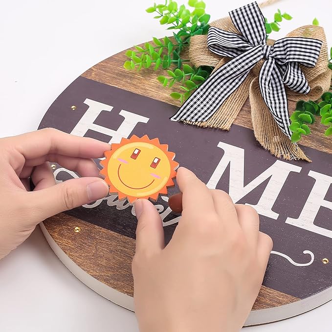 - INTERCHANGEABLE WELCOME SIGN – The seasonal welcome sign porch decor is about 12 x 12 x 0.8 inches, features 14 styles of holiday pendants with star flag, love, clover, Easter chicken, maple leaf, cake, home, football, pineapple, pumpkin, sun, sunflower and Christmas tree, you can change each accessory according to your needs to welcome each season with a different feeling.