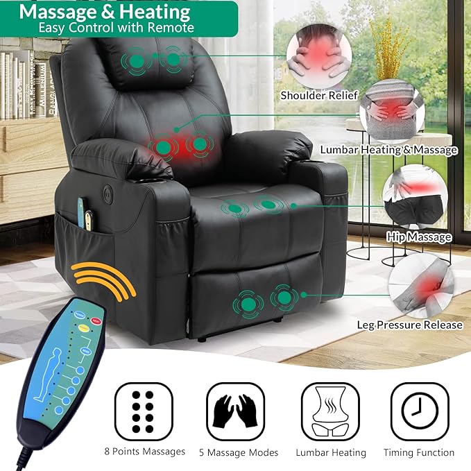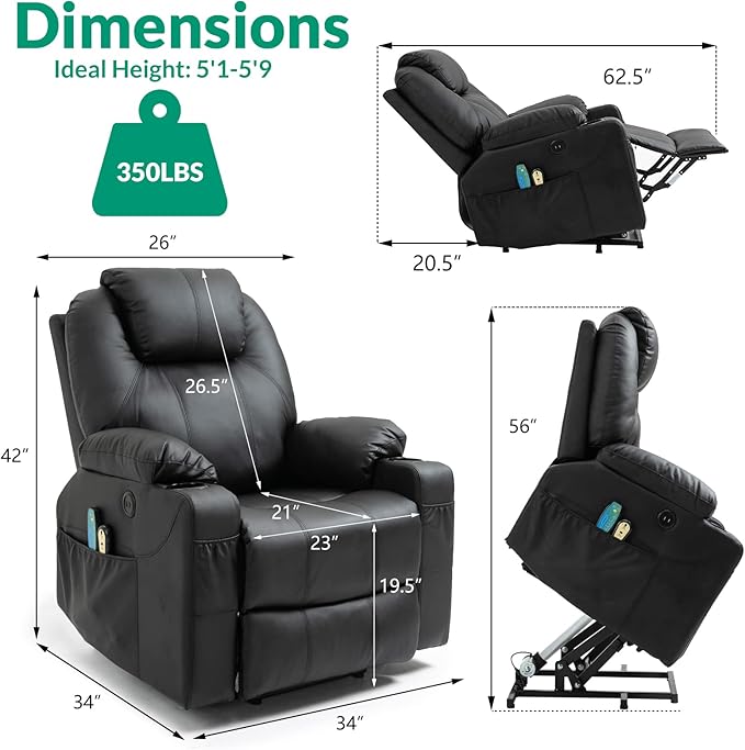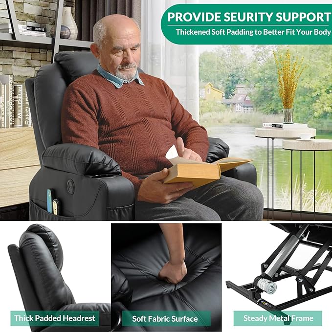 VIVIJASON Power Lift Chair Electric Recliner for Elderly Heated Vibration Massage Faux Leather Recliner Chair with 2 Remote Controls, Cup Holders, Side Pockets & USB Ports for Living Room (Black)