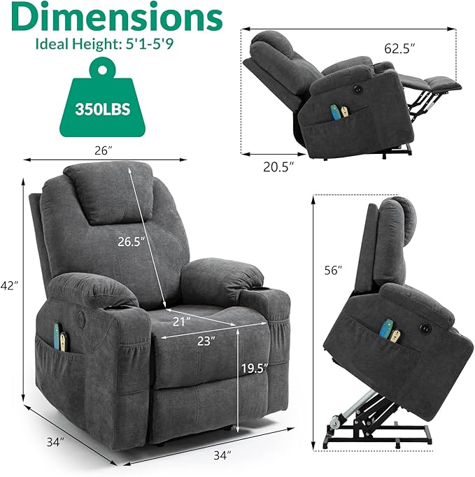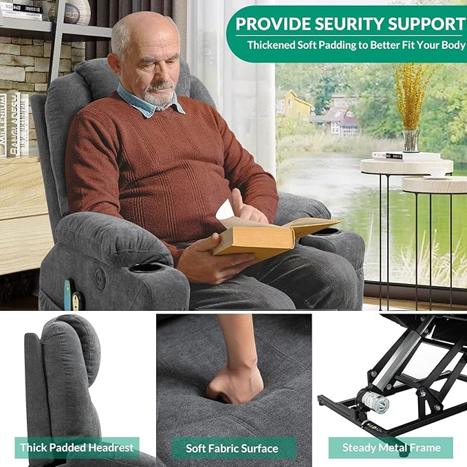 - 【Power Lift Recliner】 - The TUV certified motor equipped recliner can lift you up when you want to get up from chair, by pressing a button on the remote control, it lifts or reclines smoothly and quietly, help the elderly stand up easily without adding stress to back or knees. And it features reclining to different angles by electric control, you can lie down in a cozy position and take a rest, or TV watching, let you relax from the busy day
