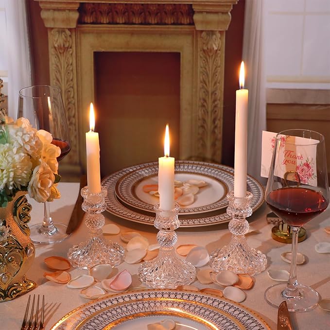 - ❤️Candlestick Holders Set [CANDLE EXCLUDED)-- Universal Taper Size: Top inner diameter 0.78'', bottom diameter is 3.15''x 4''H. You will receive 12pcs clear taper candle holders, they fit most standard taper candles, chime candles and flameless colorful LED candles. [NOTE]You wanna candles stands straight? Melt the bottoms of the candlesticks into the holder and hold it in place for 10sec! And drip wax is also very easy to clean.