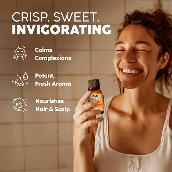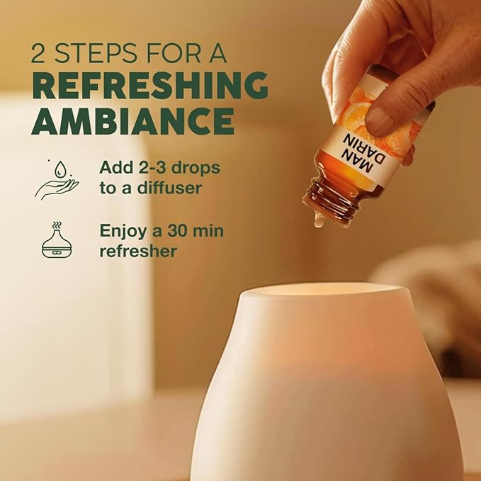 - Stay uplifted with mandarin essential oil for diffuser. Sweet and tangy, our mandarin oil instills a refreshing uplift to weary bodies. Add 1-2 drops in a diffuser to enjoy its fruity aroma.