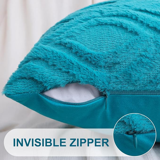 decorUhome Fall Throw Pillow Covers 16x16 Inch Set of 2, Soft Plush Decorative Faux Fur Teal Solid Couch Pillow Covers, Accent Farmhouse Neutral Square Euro Pillow Cases for Sofa Bed Living Room