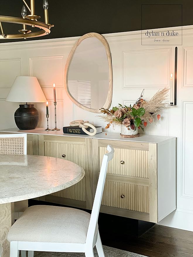 - [MID-CENTURY AESTHETIC DECOR] Celebrating the beauty of imperfection, this wood framed wall mirror is distinguished by its striking asymmetrical design. Crafted of beautiful wood, its fluid, undulating form feels at once organic and elegant, creating a one-of-a-kind focal point in your interior. Inspired by Italian mid-century design.