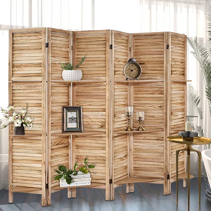 Room Divider with Shelves, Privacy Screen, Room Dividers and Folding Privacy Screens, 6 Panel Wood Temporary Wall Partition Separation Separator, Natural