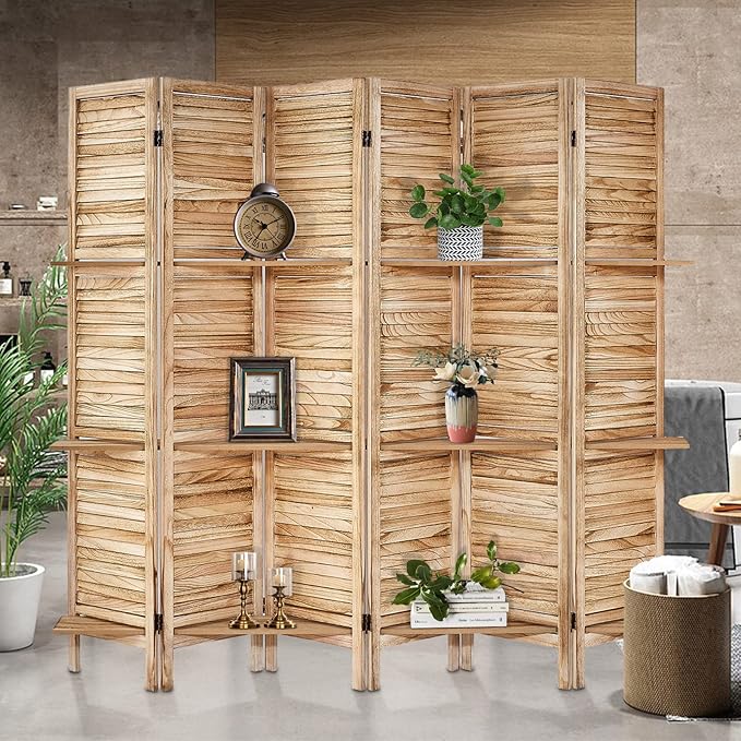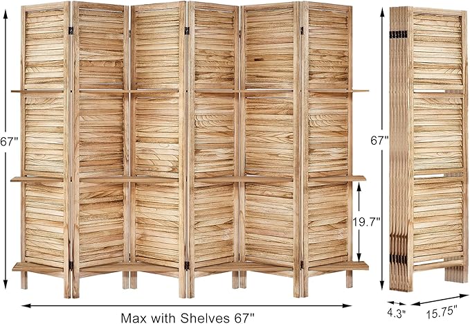 - Room Dividers with Shelves: The portable panel screen is built on solid wood, features a stylish louvered slat with 3 manufactured wood shelves to display your favorite decoratives while creating a smaller enclosed private space within a corner or along a wall.