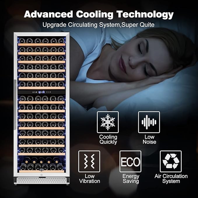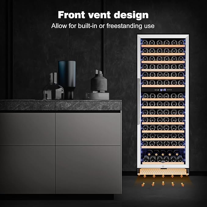 - 180 Bottles Large Capacity:The 24'' dual zone wine fridge features 14 beech wooden shelves that can store up to 180 bottles of standard Bordeaux (750 ml) wine and the bottom shelf has large capacity that you can load large bottles;Durable beech wooden shelves No shake No damage bottle when sliding in or out;