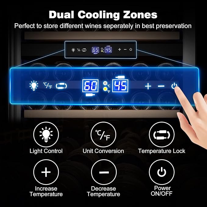 - Dual Zone Wine Fridge:This dual zone wine cooler is a unique design that addresses the hassles of storing diverse wine collections, It can accommodate larger bottles, such as Champagne;The upper zone ranges from 40°F to 55 °F while the lower zone is between 55°F to 65°F; Dual Zone Wine Cooler enables you to store varying wines corresponding to their different temperature range needs;