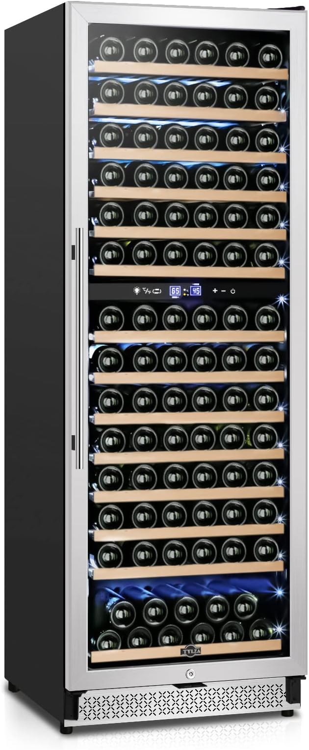 Tylza 24 Inch Wine Fridge Dual Zone, 180 Bottle Wine Cooler Refrigerator With Stainless Steel and Professional Compressor, Fast Cooling Low Noise and No Fog Built-in or Freestanding