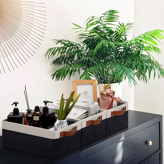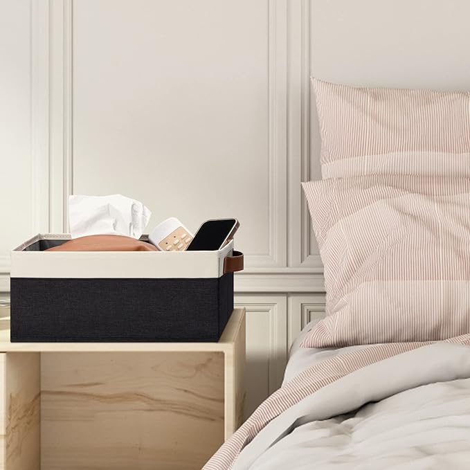 GhvyenntteS Storage Baskets for Organizing, Fabric Storage Bins with Leather H&les, Foldable Rectangular Storage Baskets for Shelves, Closets, Home, Office(Black/White, 6 Pack)11.8X7.9X5.1 in
