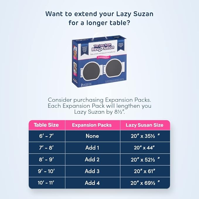 - ♾️ EASILY EXPANDABLE FOR ANY TABLE SIZE- This lazy susan turntable is easily expandable. Extra trays, which are available separately, can be added. The lazy susan extension allows you to extend your Lazy Susan Revolution to any table size.