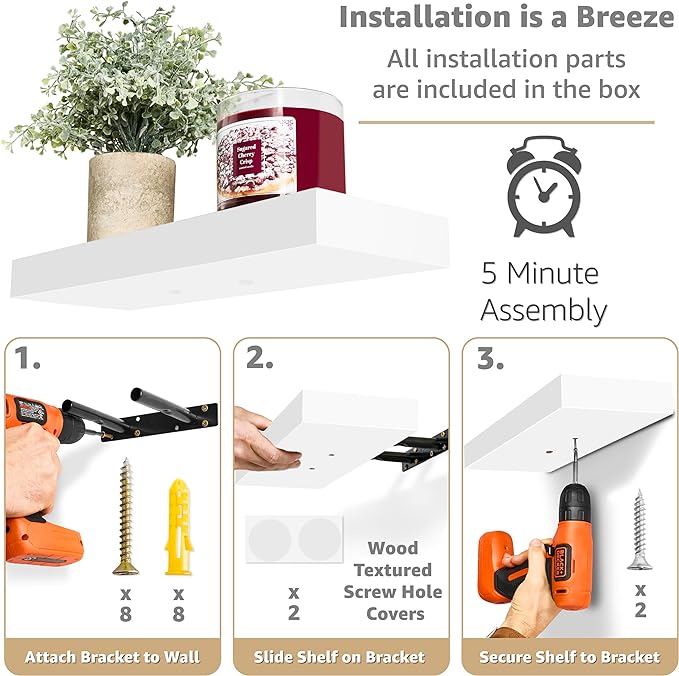 - Easy Installation: Mounting hardware INCLUDED the Hanging shelves are made of beautiful MDF with PVC + Bracket - Sturdy enough to arrange and display your favorite small objects - Attaches firmly to the wall without visible support - Minor assembly required - Supports up to 22 pounds per shelf - Measures approximately 16.25 inch L x 5.50 inch W - Each display shelf 1.5 inch thick