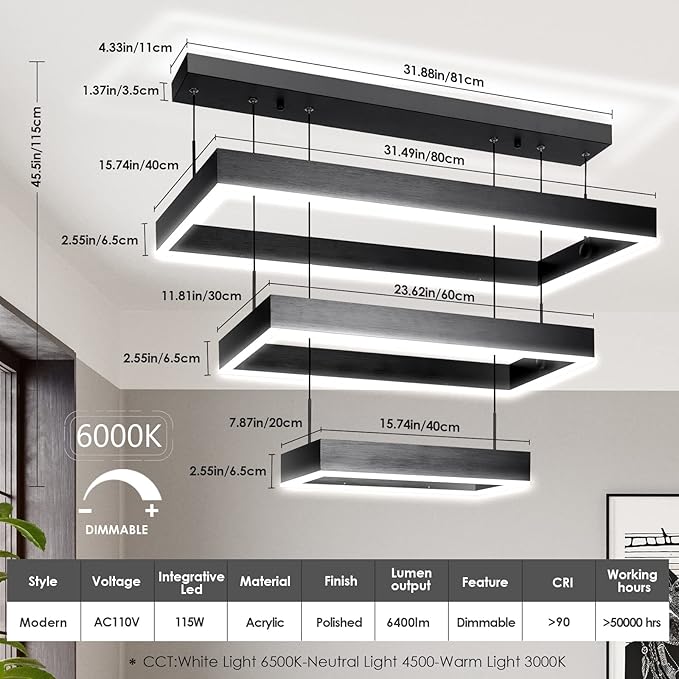 - 【Modern LED Pendant Light Adjustable Height】Modern living room light is suitable for many kinds of spaces. It is ideal decorative lighting for installation in bedrooms, living rooms, kitchens, dining rooms, study rooms, corridors, stairwells, attics, balconies, and offices. This black LED pendant light has three rectangular light frame dimensions: 31.49"*15.74"*2.55" ; 23.62"*11.81"*2.55"; 15.74"*7.87"*2.55"; Voltage: 110V, Power: 115W. The light area is about 10-25 square meters